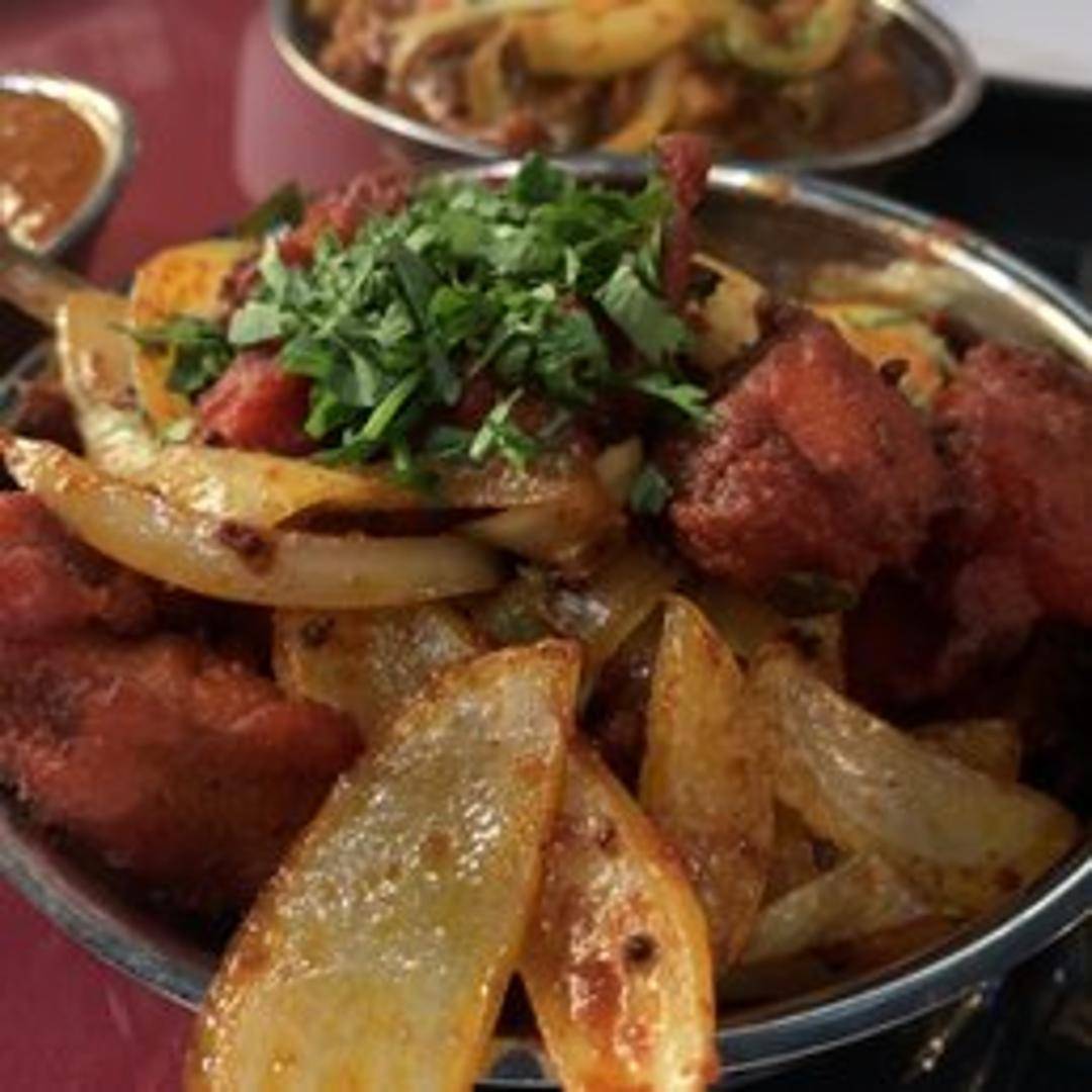A spicy, deep-fried chicken dish originating from Chennai, India. Boneless chicken pieces are marinated in a mixture of ginger, garlic, chili powder, turmeric, lemon juice, and other spices, then battered and fried until crispy. Often served as an appetizer with a spicy dipping sauce.