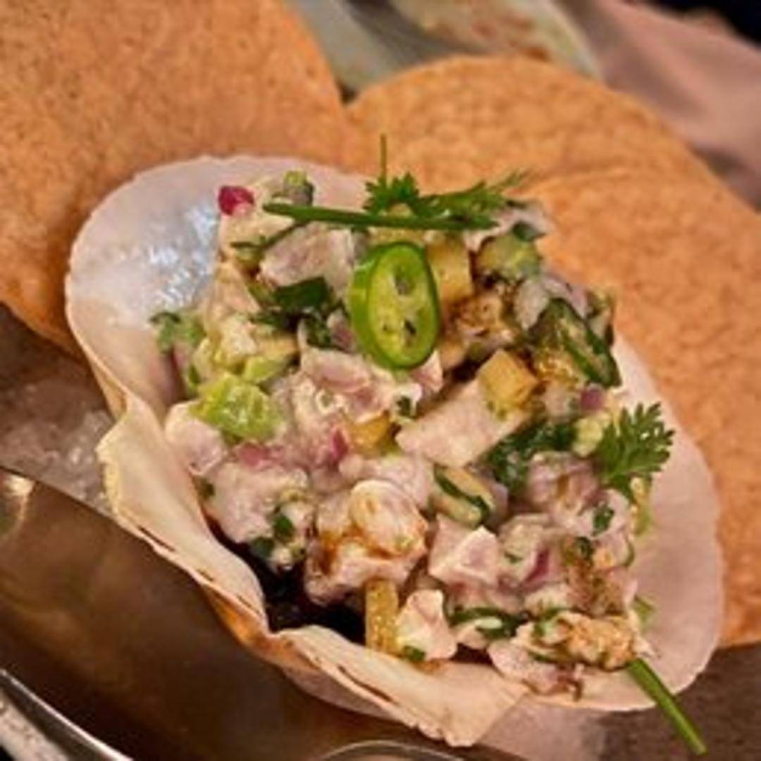 Fresh striped bass marinated in citrus juices, typically lime, and mixed with finely chopped red onion, cilantro, and chili peppers. The acidity of the citrus 'cooks' the fish, resulting in a bright, refreshing dish. Served chilled.