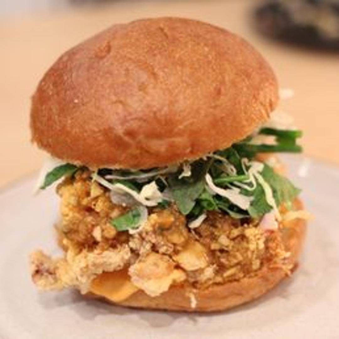 Experience an elevated take on a beloved classic with Kato's Fried Chicken Sandwich. This gourmet rendition features a succulent, perfectly seasoned chicken filet, fried to an exquisite crisp, nestled between two halves of a custom-baked artisanal bun. Complemented by a vibrant, house-made slaw and a distinctive, savory sauce, it delivers a harmonious blend of textures and sophisticated flavors.