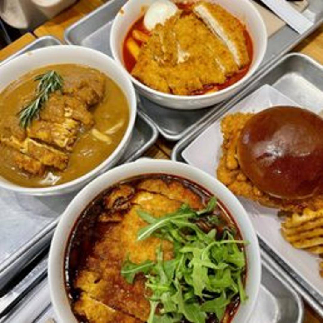 A variety of Japanese-style sandwiches featuring breaded and deep-fried cutlets (chicken, pork, or vegetarian options) served on toasted bread with shredded cabbage, katsu sauce, and other toppings.