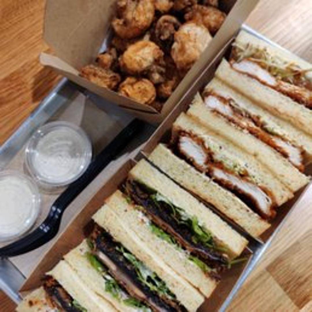 A selection of Japanese-style sandwiches, likely featuring various katsu fillings and flavorful toppings served on toasted bread.