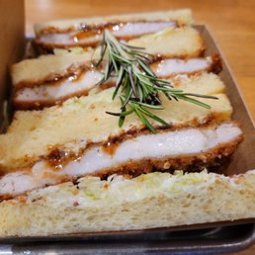 A katsu sandwich featuring a breaded and fried cutlet (likely chicken or pork) with a rosemary infused flavor, served on toasted bread with complementary toppings.