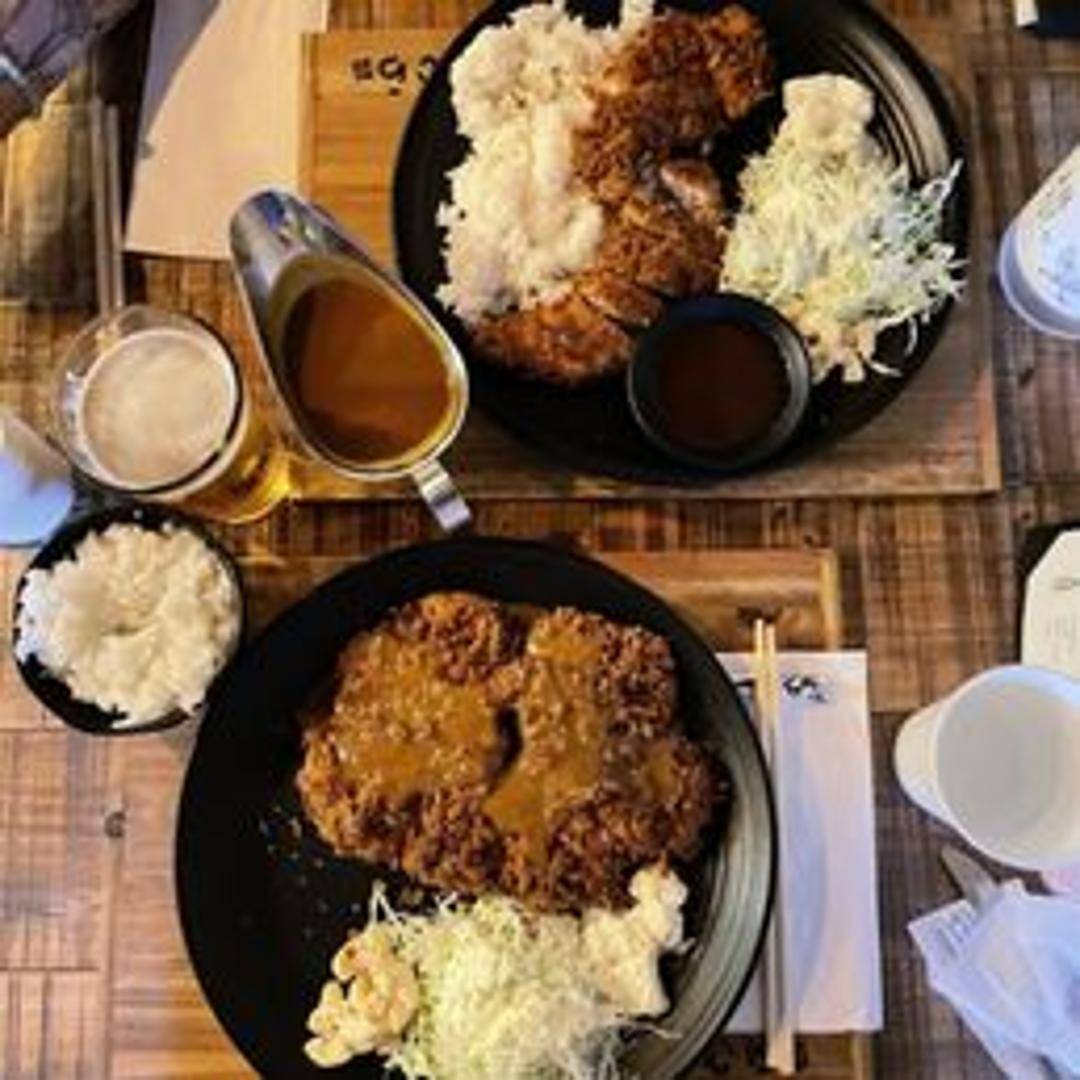 A large, crispy pork cutlet covered in a rich and savory donkatsu sauce. Served with rice and a side of shredded cabbage or other vegetables.