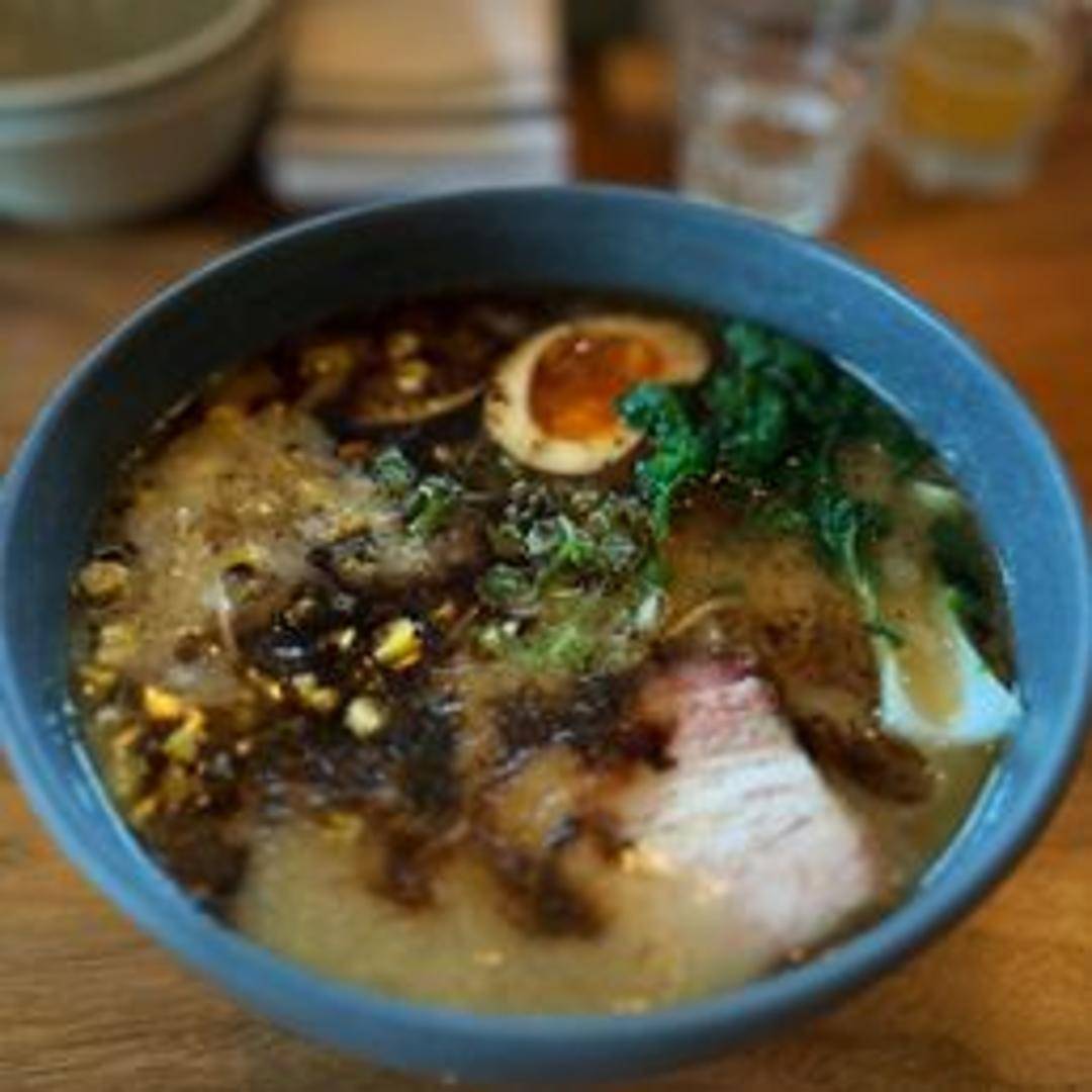 Rich pork broth ramen featuring tender pork belly, fragrant garlic oil, seasoned egg, nori seaweed, and scallions. Noodles are perfectly cooked and offer a satisfying slurp.