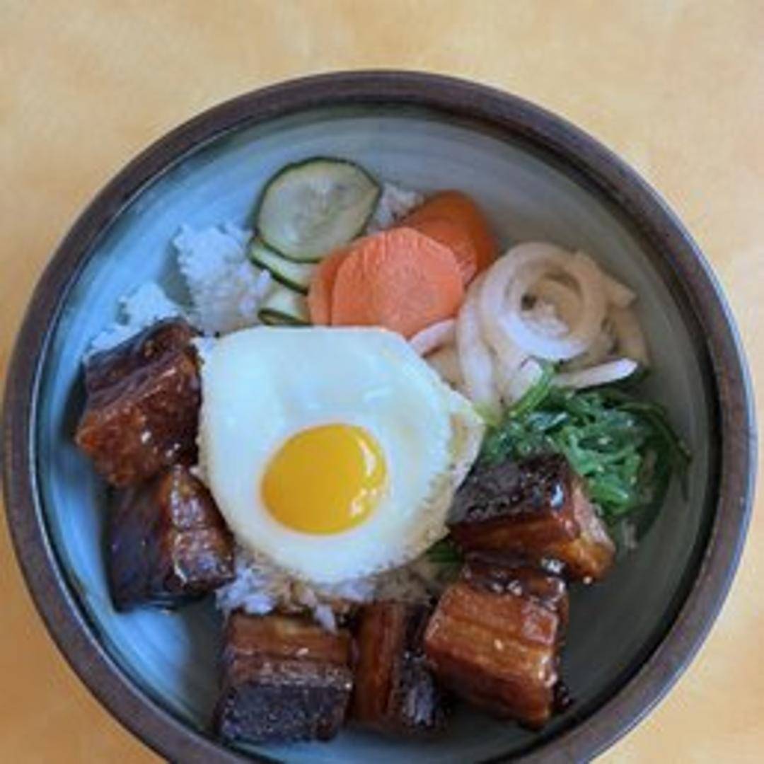 Crispy, succulent roasted pig (lechon) served over a bed of steamed rice. Topped with savory lechon sauce (liver-based sauce) and garnished with pickled papaya (atchara).