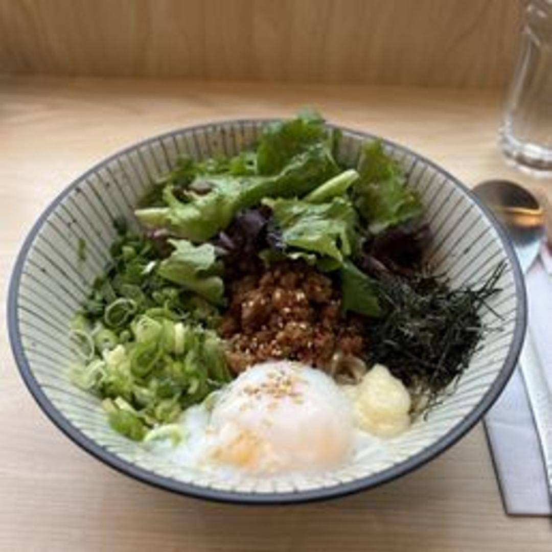 A dry ramen dish featuring thick, chewy noodles tossed in a rich and savory soy sauce-based sauce. Topped with a variety of ingredients such as seasoned ground pork, green onions, nori seaweed, bamboo shoots, and a soft boiled egg. Mix vigorously for the best flavor.