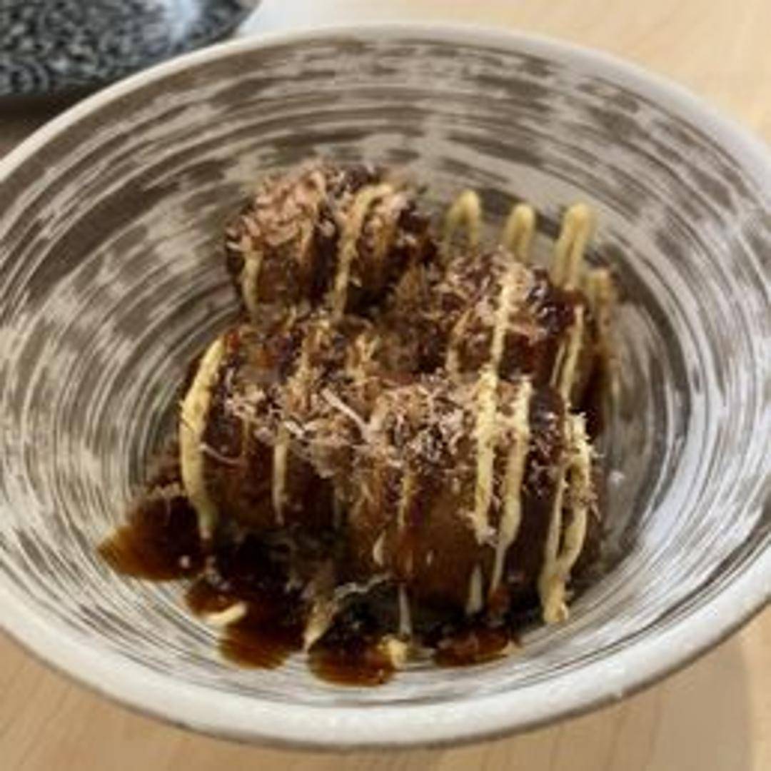 Classic Japanese street food consisting of ball-shaped octopus dumplings. The tender octopus is encased in a savory batter and cooked to a crispy exterior, drizzled with takoyaki sauce, Japanese mayonnaise, dried seaweed flakes (aonori), and shaved bonito flakes (katsuobushi).