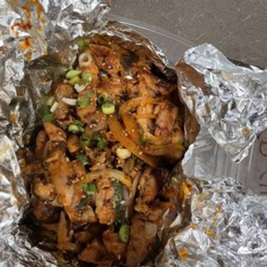 Korean-style spicy chicken, marinated in a vibrant gochujang-based sauce. The chicken is typically grilled or stir-fried to perfection, offering a delicious balance of heat, sweetness, and savory flavors. Often garnished with sesame seeds and green onions.