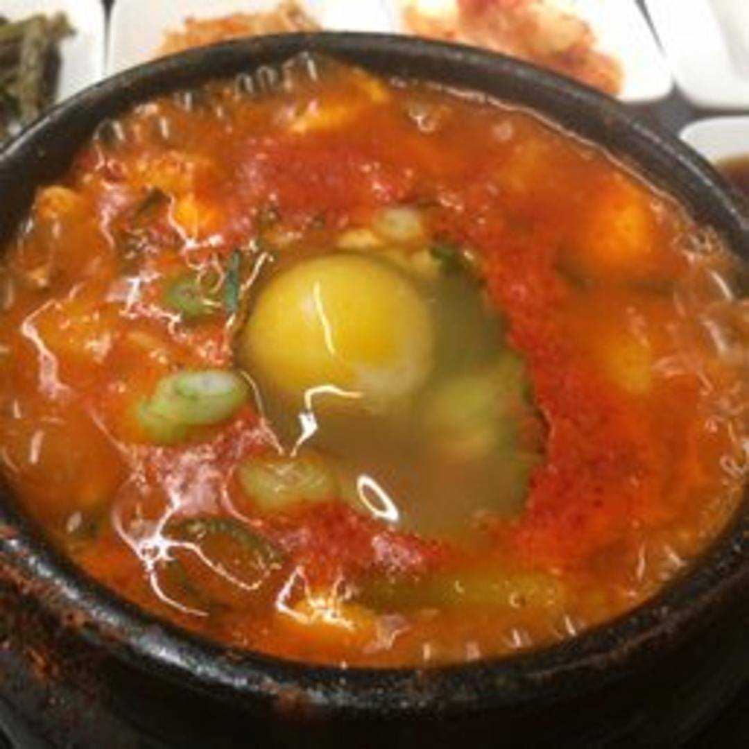 A fiery and flavorful Korean stew featuring soft tofu, a medley of fresh seafood (typically including shrimp, mussels, and clams), vegetables, and a rich, spicy broth. Served bubbling hot in a traditional earthenware pot, this stew is perfect for warming up on a cold day and pairs well with rice.