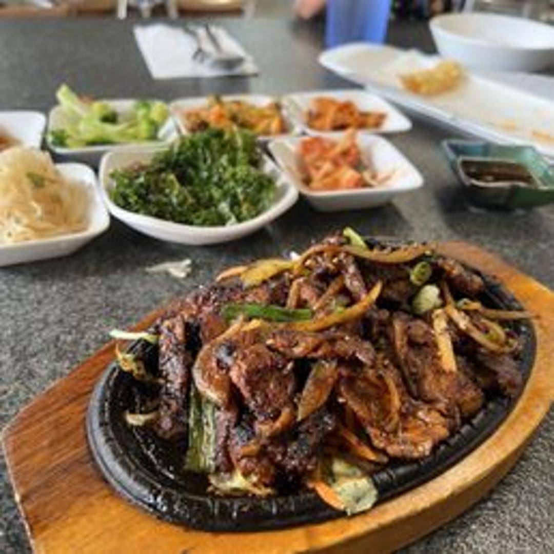 Thinly sliced pork belly marinated in a fiery Korean chili paste (gochujang) based sauce. Grilled to smoky perfection, resulting in a delicious combination of crispy edges and tender, flavorful meat. Served with lettuce wraps and an array of banchan (Korean side dishes) for a complete and interactive dining experience.