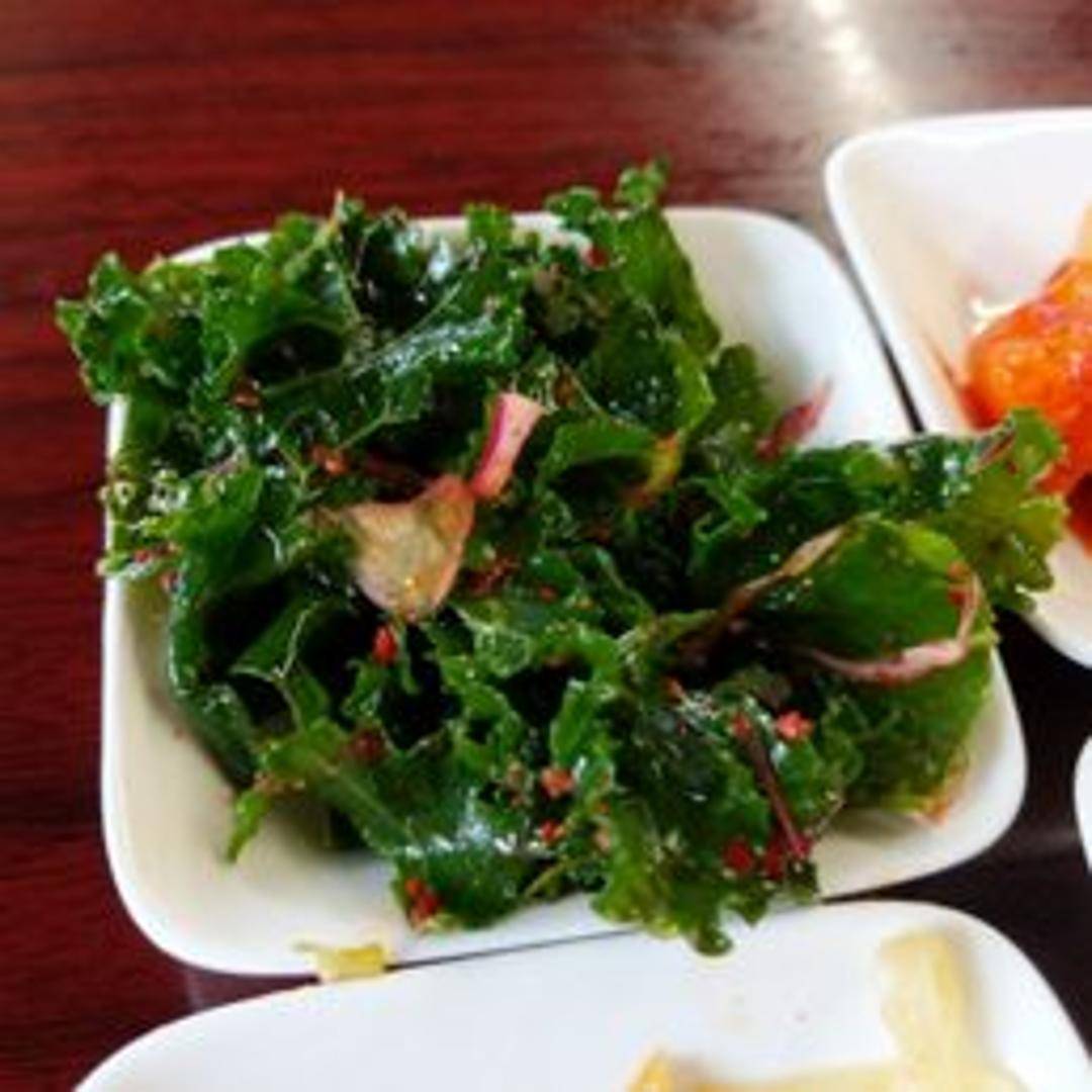 A vibrant and healthy salad featuring fresh kale, massaged for tenderness. Tossed with a light vinaigrette dressing and complemented by crunchy toppings like toasted nuts, seeds, and dried cranberries for added texture and flavor.