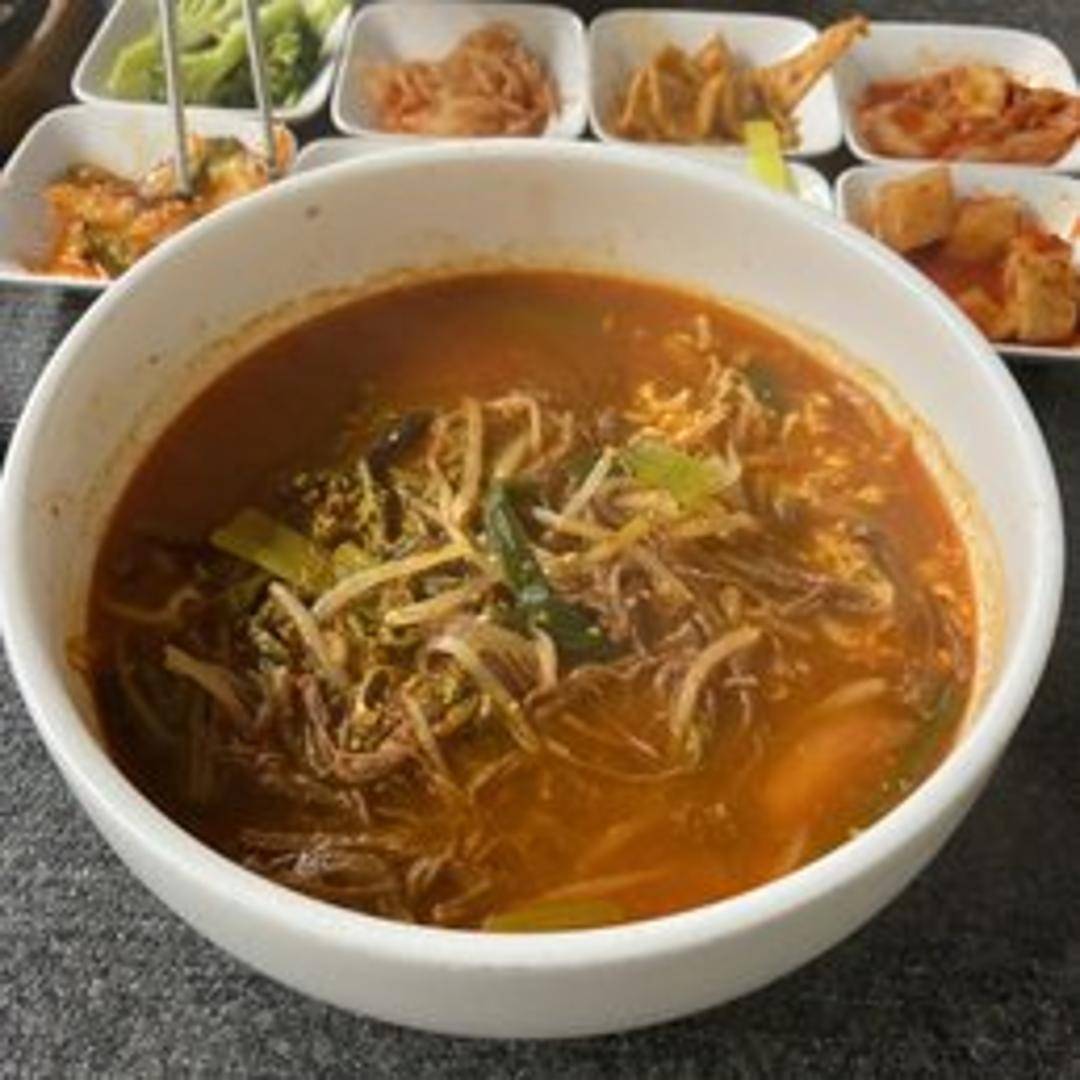 A spicy and hearty beef soup featuring shredded beef, scallions, bean sprouts, fernbrake (gosari), and other vegetables in a rich, red broth seasoned with gochugaru (Korean chili powder). Often contains glass noodles and may include egg.
