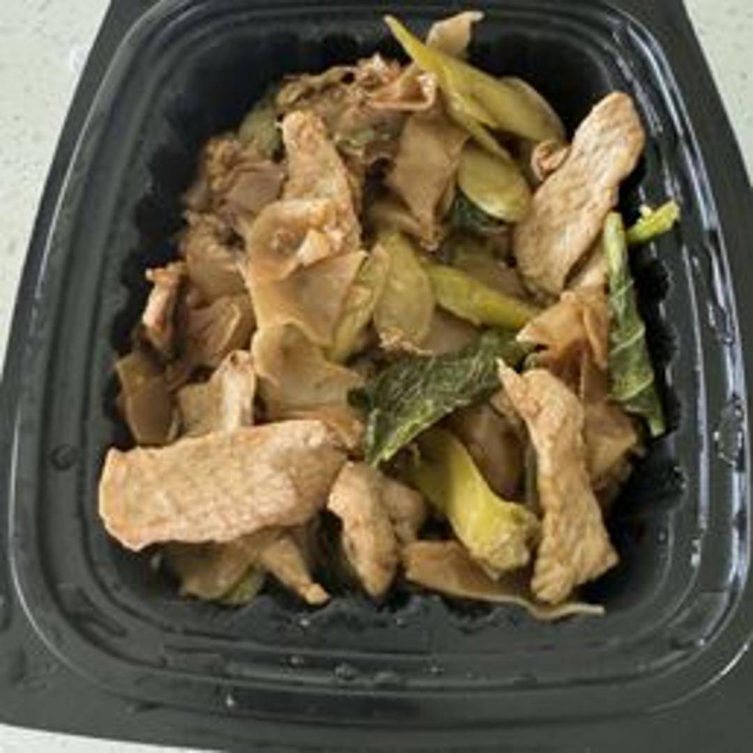 Stir-fried wide rice noodles with egg, Chinese broccoli, and your choice of protein in a sweet soy sauce.
