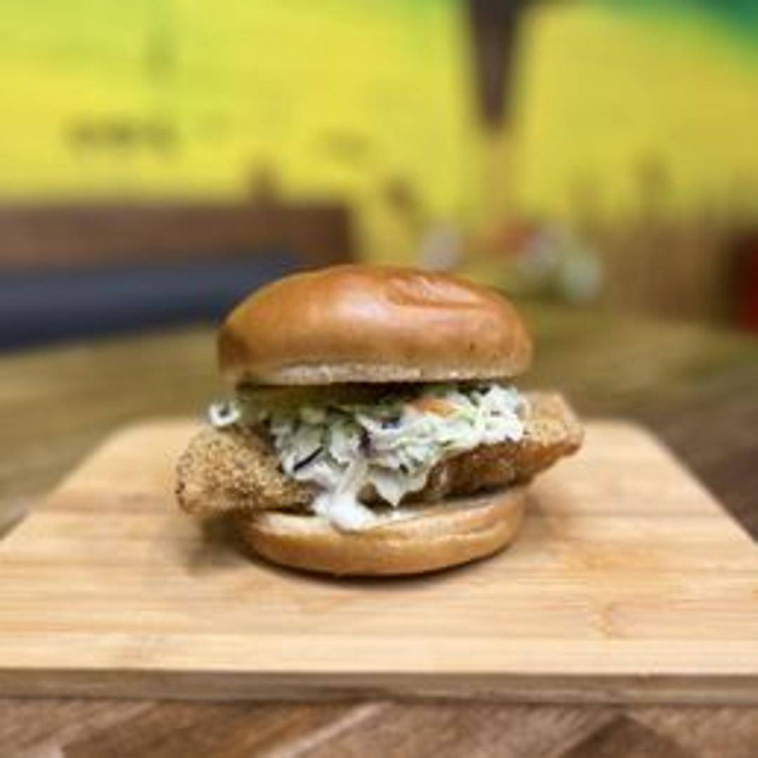 A delicious sandwich featuring a crispy fried fish fillet, served on a soft bun with tartar sauce, lettuce, and tomato.