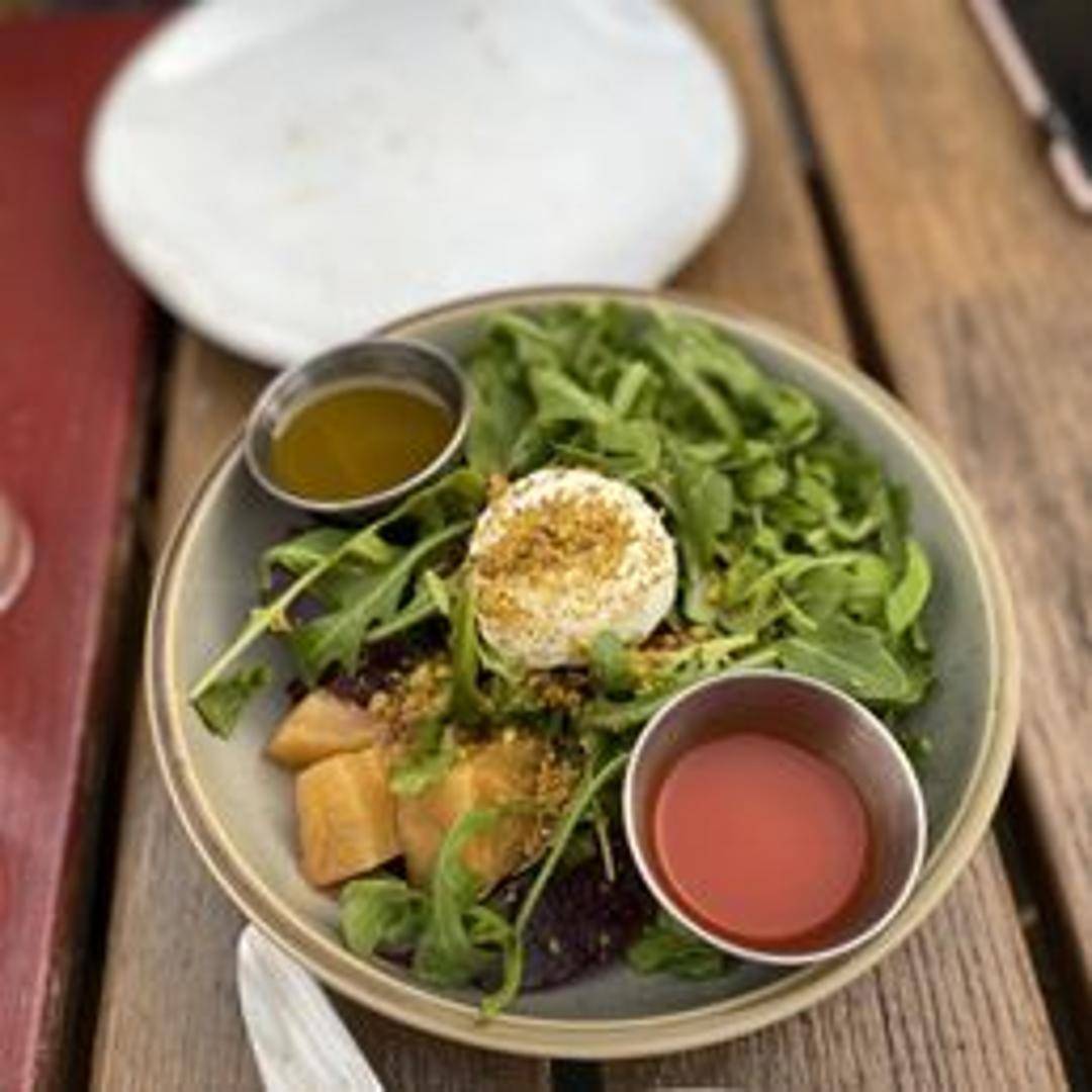 A vibrant and refreshing salad featuring earthy, tender roasted beets paired with crisp, peppery arugula. Typically dressed with a light vinaigrette and often complemented by ingredients like goat cheese, walnuts, or citrus for a balanced flavor profile.
