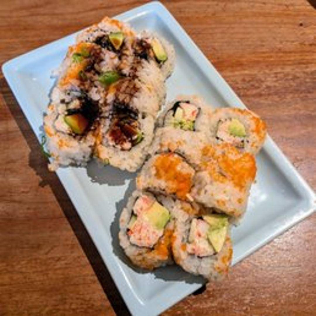 Four pieces of the classic California roll (imitation crab, avocado, cucumber) served with a side of pickled ginger, wasabi, and soy sauce. Part of a larger combo meal.