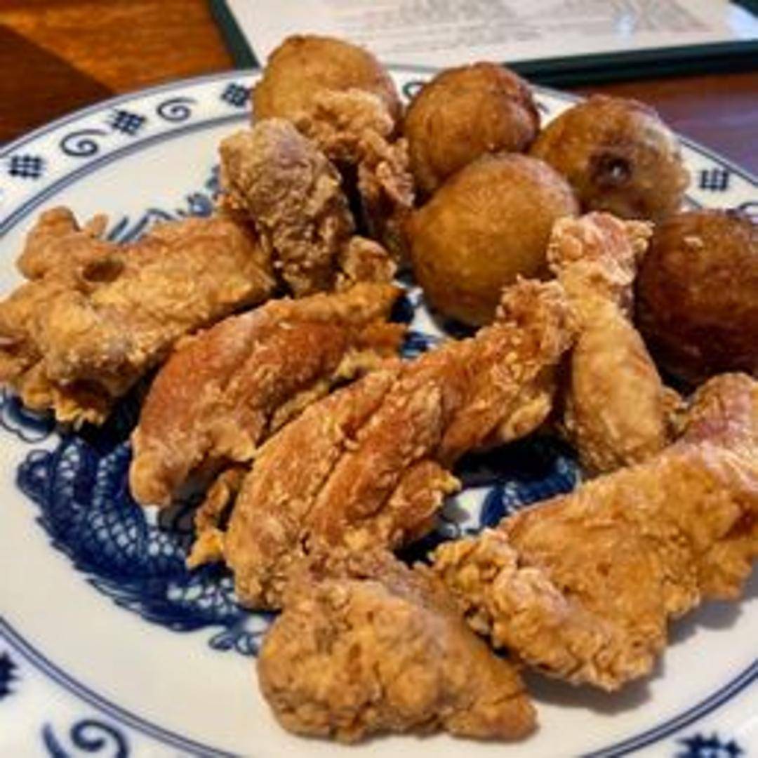 Deep-fried octopus balls, cooked in a special molded pan. Topped with takoyaki sauce, Japanese mayonnaise, dried seaweed flakes (aonori), and dried bonito flakes (katsuobushi).