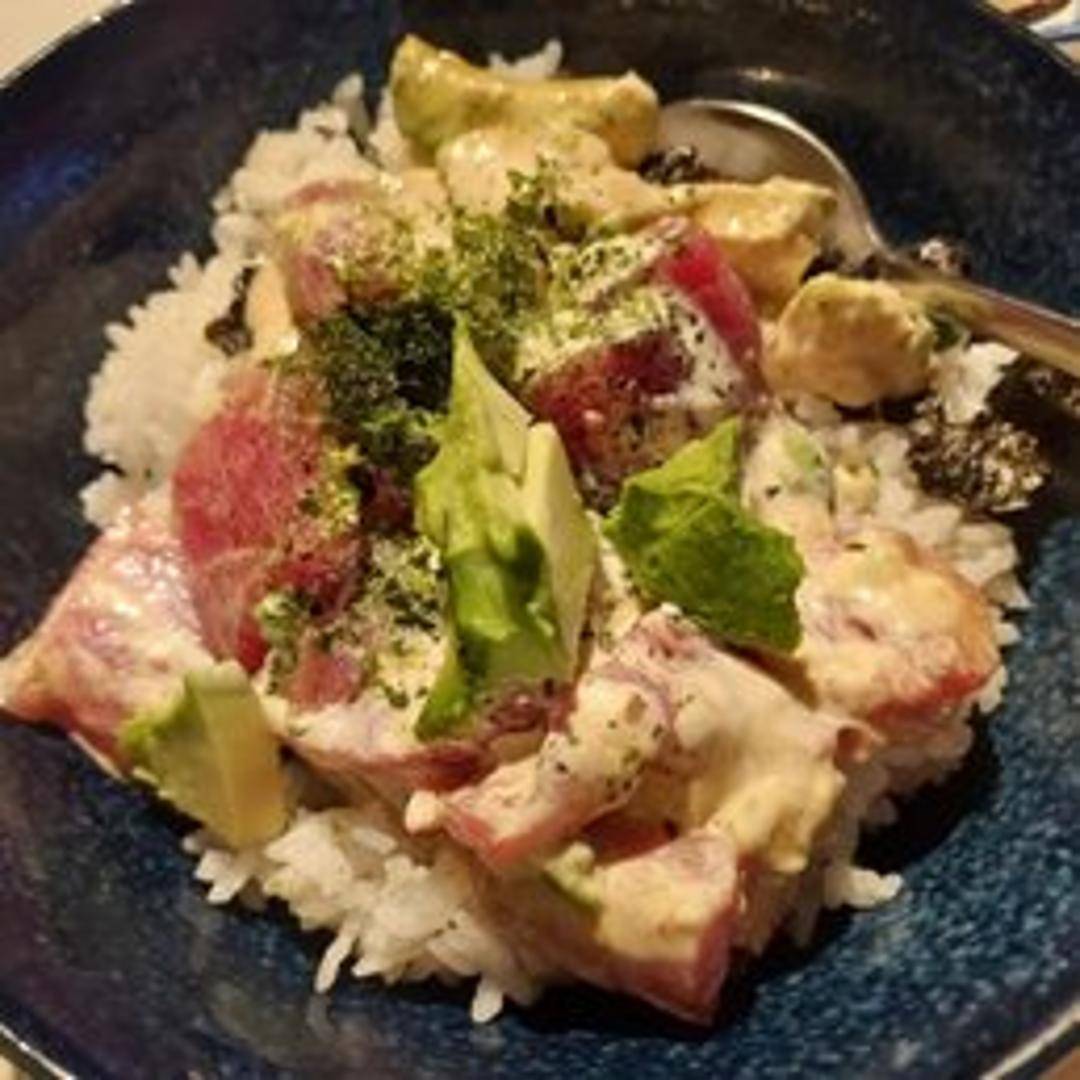 A flavorful rice bowl topped with fresh, high-quality tuna, avocado, seaweed salad, sesame seeds, and a drizzle of savory sauce. Served over a bed of seasoned sushi rice.