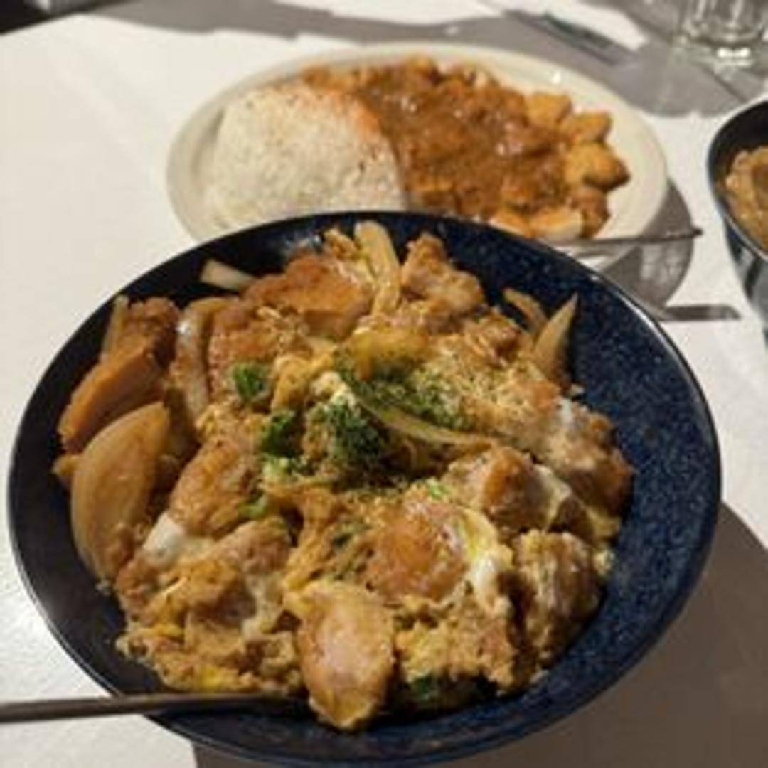 A hearty rice bowl featuring a crispy, deep-fried pork cutlet (tonkatsu) simmered in a savory dashi broth with onions and egg. Served over a bed of fluffy steamed rice.