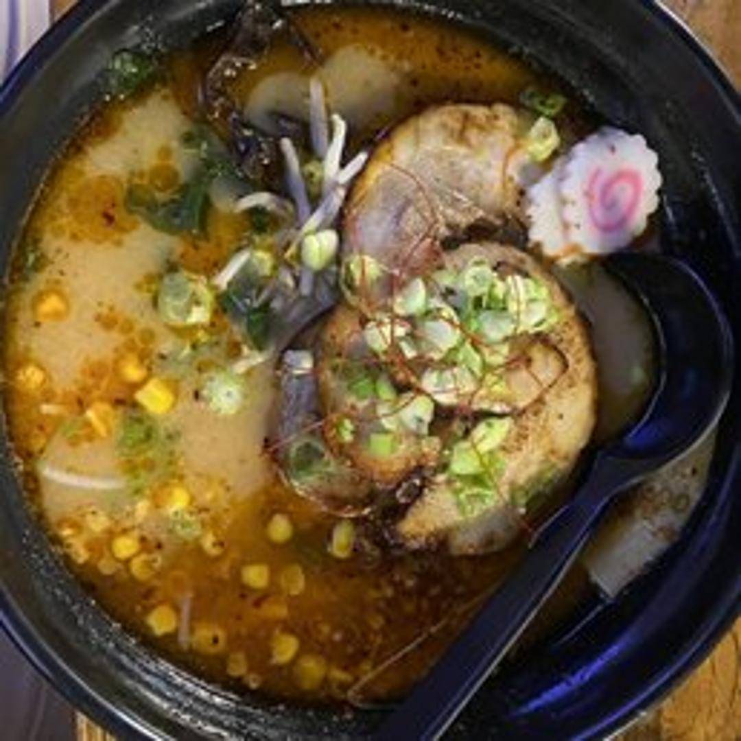A flavorful ramen featuring a rich and savory miso broth with a spicy kick. Includes noodles, and may contain toppings such as chashu pork, seasoned egg, nori seaweed, bamboo shoots, scallions, and bean sprouts. Spice level may vary.