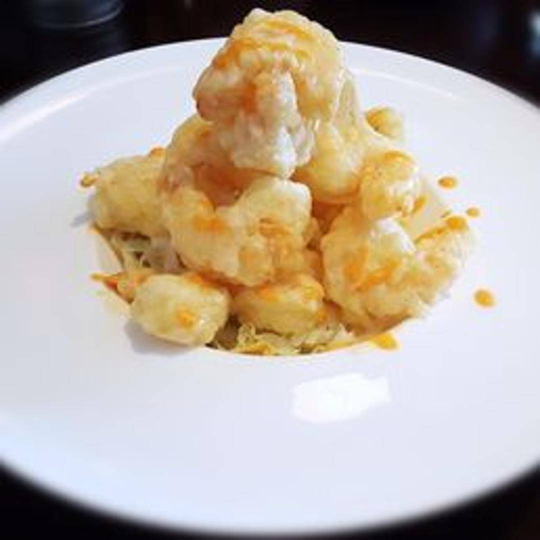 A visually appealing sushi roll featuring crispy tempura shrimp as the primary ingredient. Often includes other elements such as avocado, cucumber, and a savory sauce, all wrapped in sushi rice and seaweed. Garnished for aesthetic appeal.