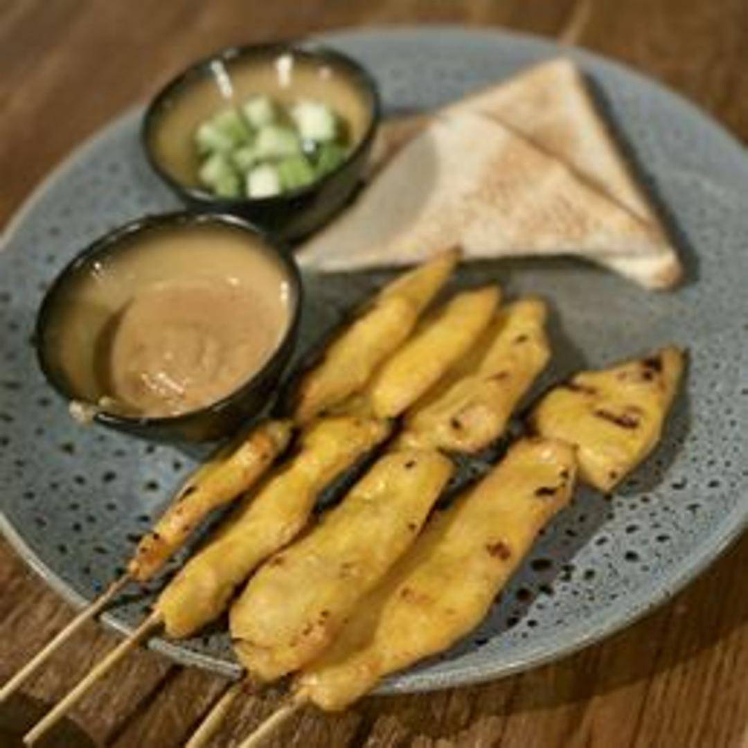 Grilled marinated chicken skewers served with a creamy peanut sauce and cucumber relish.