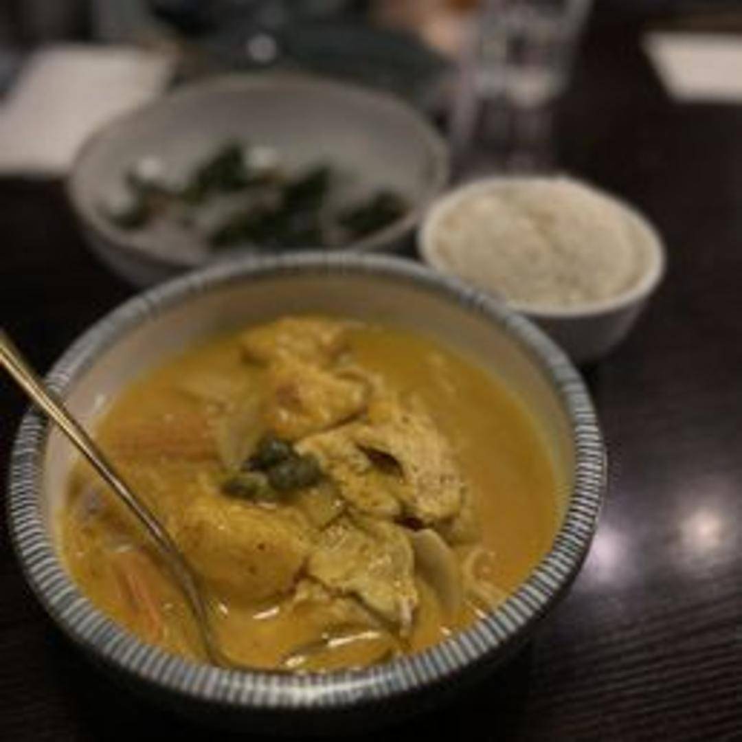 A mild yellow curry with potatoes, carrots, and onions, simmered in coconut milk. Choice of protein: tofu, vegetables, chicken, pork, beef, shrimp, or seafood.