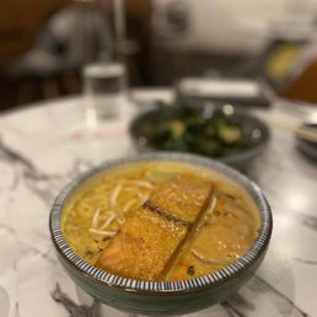 Grilled salmon fillet served over rice noodles in a creamy red curry sauce with mixed vegetables.