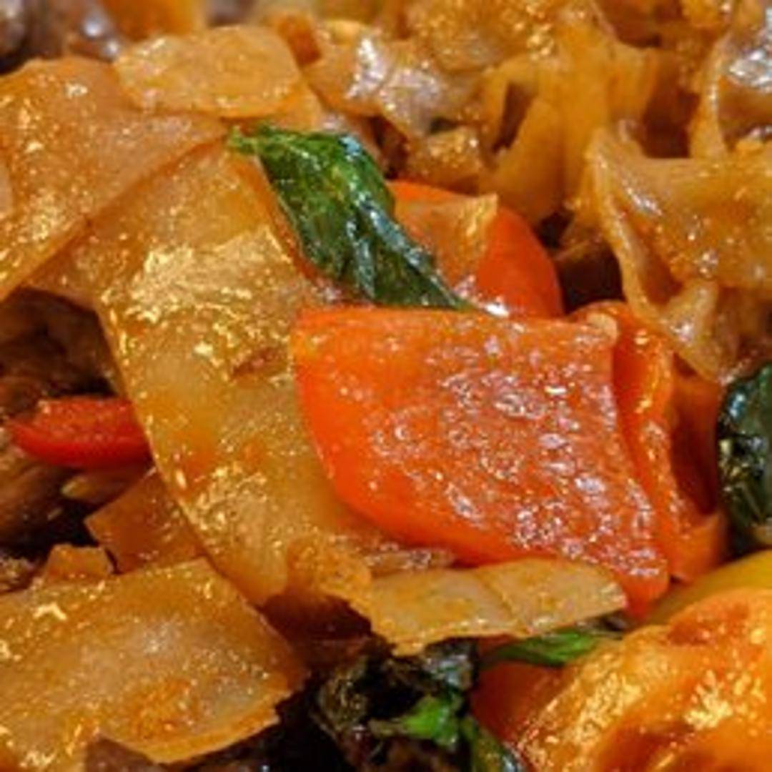 Stir-fried wide rice noodles with egg, tomatoes, bell peppers, onions, and basil in a spicy chili sauce. Choice of protein: tofu, vegetables, chicken, pork, beef, shrimp, or seafood.