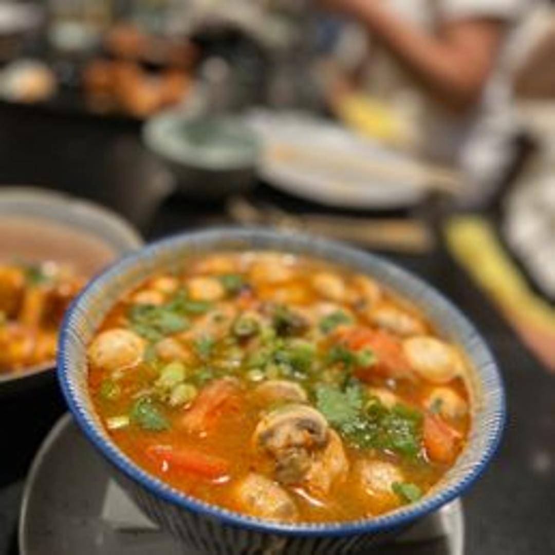 A hot and sour soup with lemongrass, galangal, lime leaves, mushrooms, tomatoes, and cilantro. Choice of protein: tofu, vegetables, chicken, pork, beef, shrimp, or seafood.