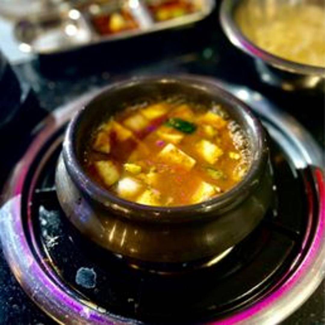 A hearty and flavorful Korean stew featuring a rich, fermented soybean paste broth. Contains tofu, vegetables (such as zucchini, onions, and potatoes), and sometimes pork or seafood. Served bubbling hot in a traditional earthenware pot. A comforting and savory dish, perfect for a cold day.