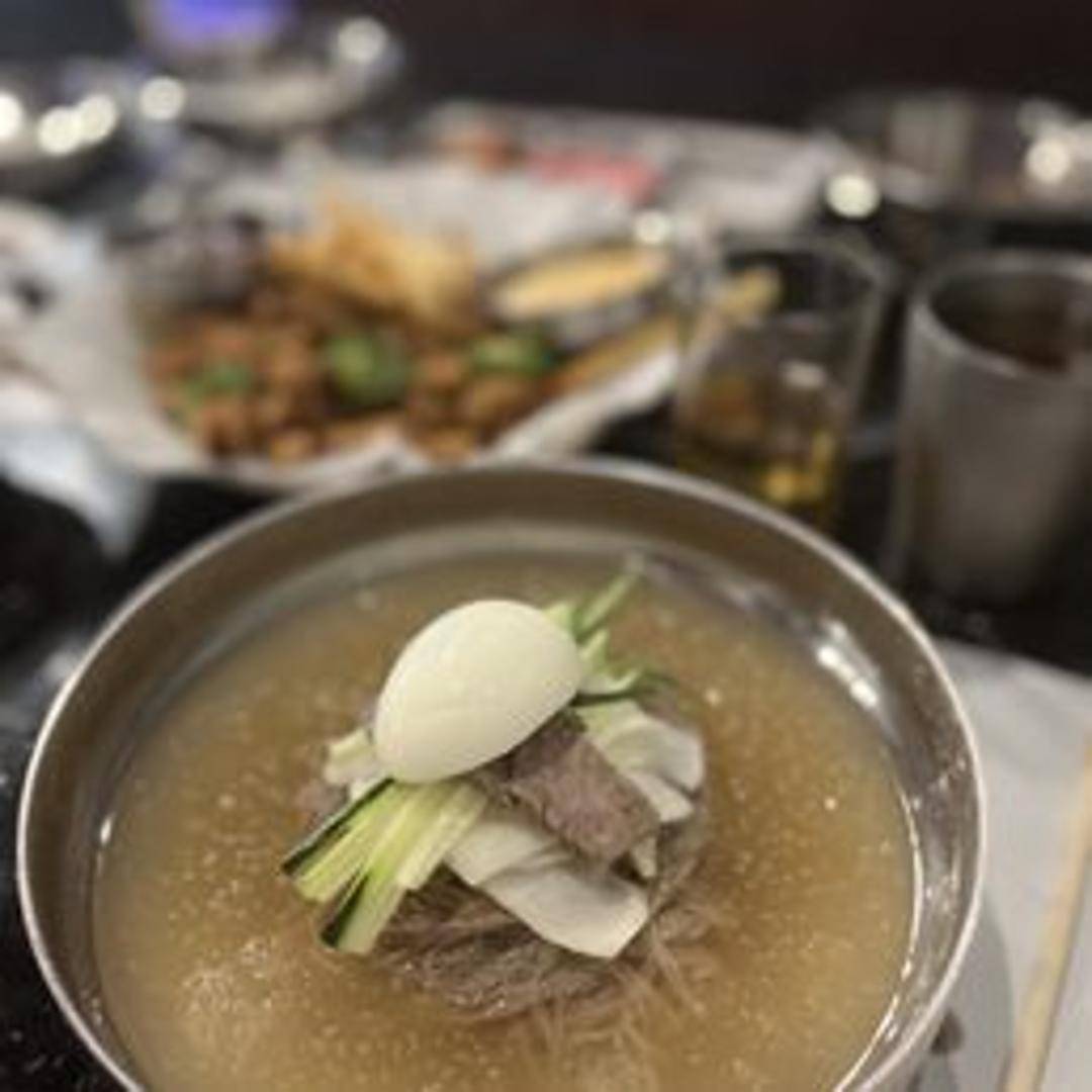 Cold wheat or buckwheat noodles served in a chilled broth with spicy and tangy radish kimchi. A refreshing and flavorful dish, perfect for hot weather. May contain other vegetables and a boiled egg.
