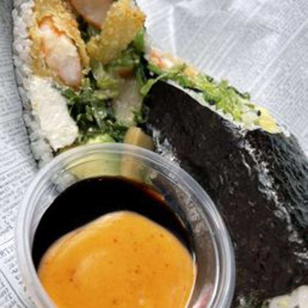 Crispy shrimp tempura rolled with rice and nori seaweed. Contains avocado and cucumber. Served with tempura sauce.