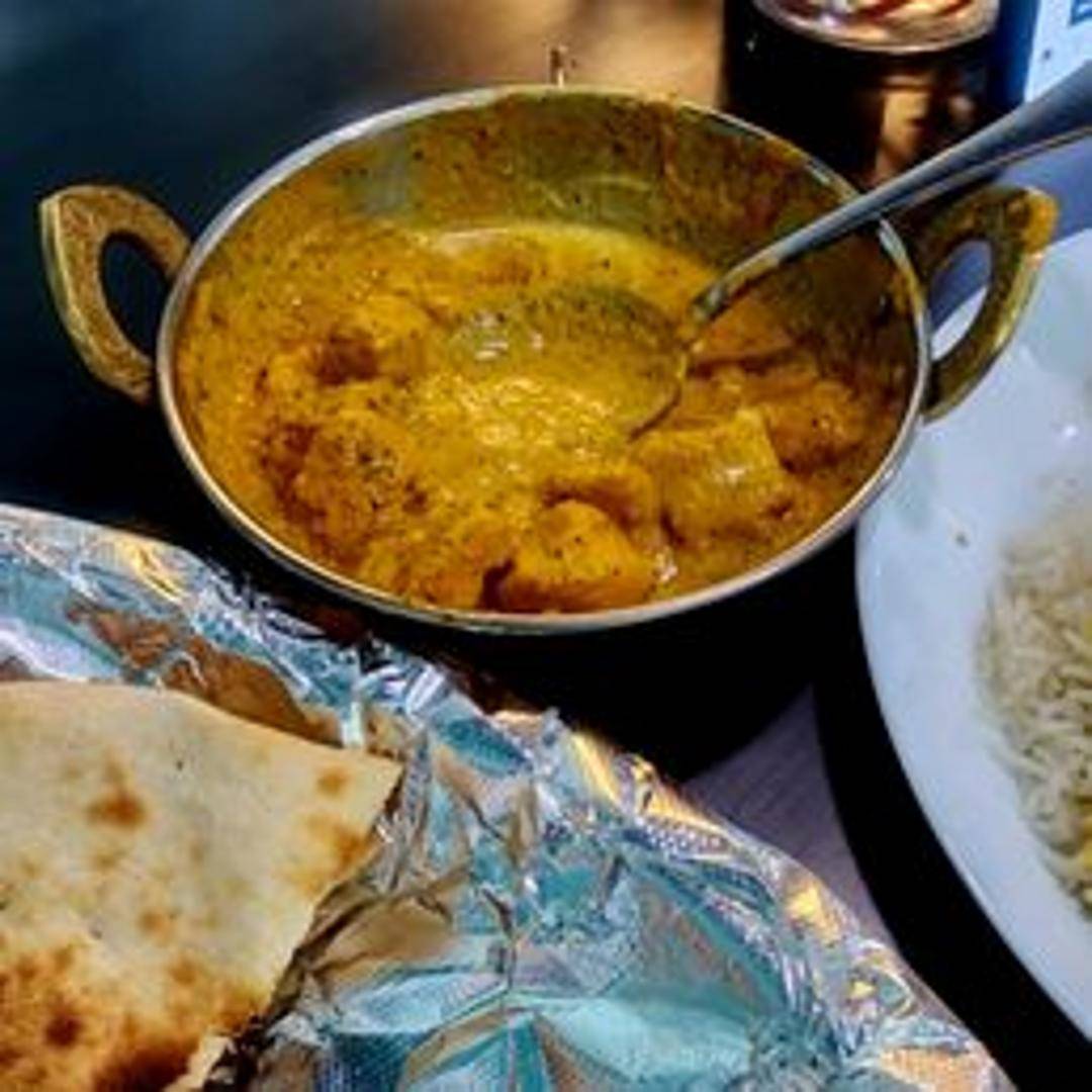 A creamy and mild Indian curry made with yogurt, cream, nuts, and spices, often featuring chicken, lamb, or vegetables.