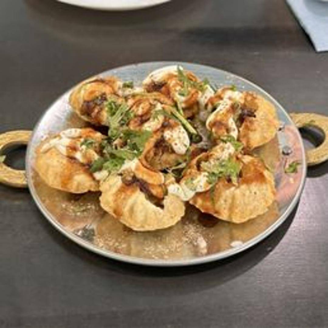 A popular Indian street food consisting of crispy puri shells filled with potatoes, chickpeas, yogurt, chutneys, and spices.