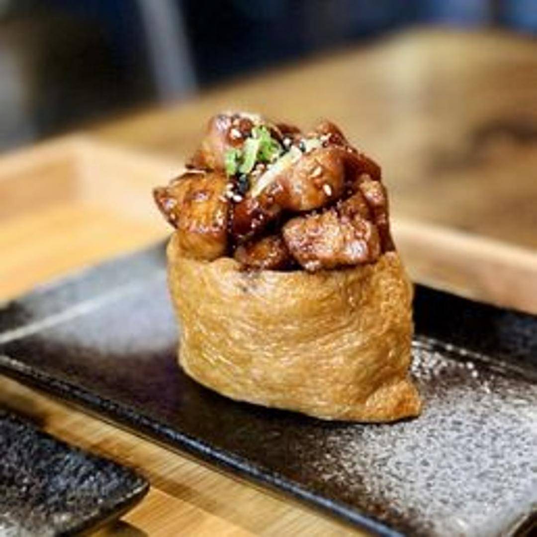 Savory yubu (tofu pockets) filled with a spicy chicken mixture. The tofu pockets are lightly fried and offer a soft, slightly chewy texture that contrasts with the flavorful and spicy filling. A popular Korean street food.