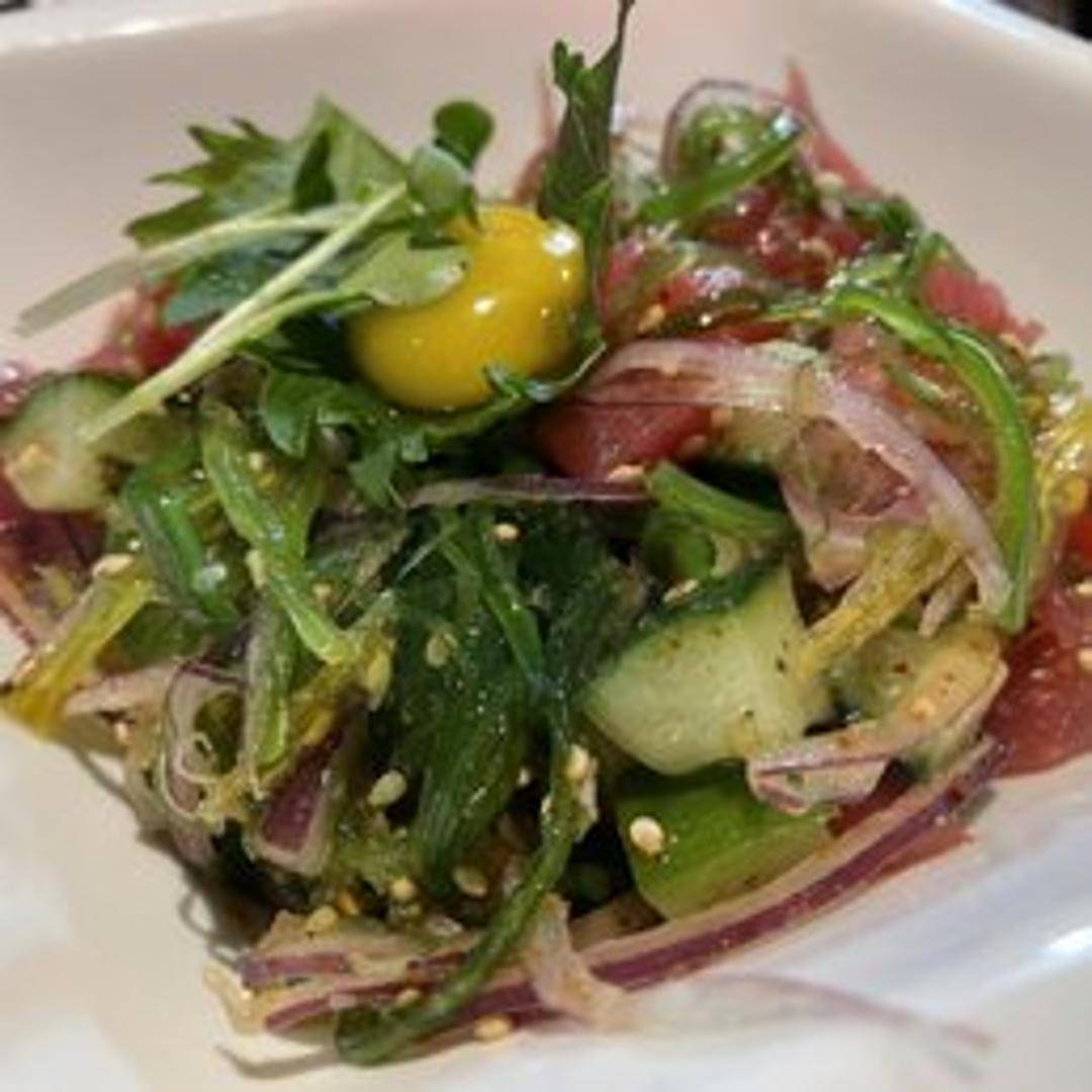 A refreshing salad featuring cubed raw fish (typically tuna or salmon), marinated in a flavorful sauce with seaweed salad, avocado, edamame, sesame seeds, and a light dressing. Served over a bed of rice or mixed greens.
