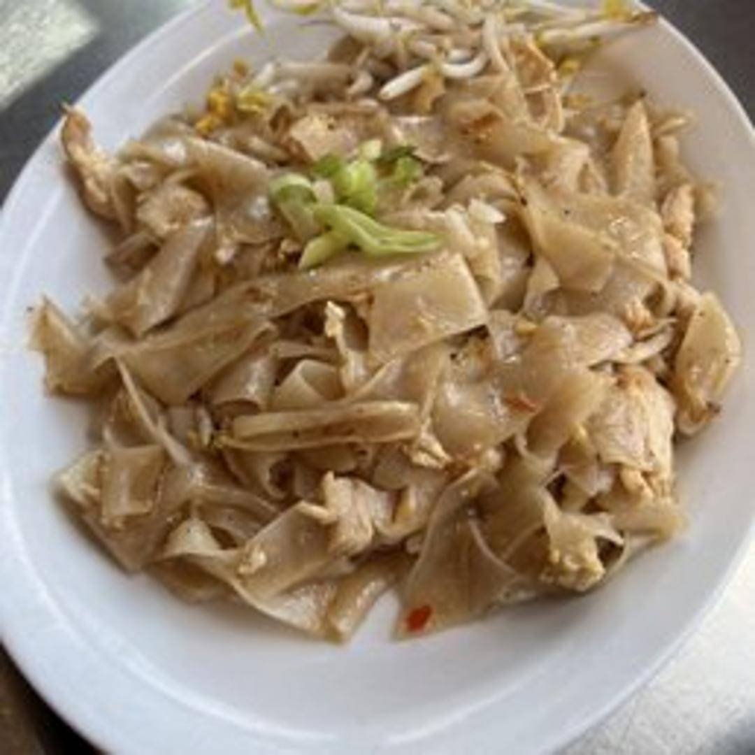 Wide rice noodles stir-fried with egg, chicken, shrimp, bean sprouts, green onions, and crushed peanuts in a savory-sweet tamarind sauce.