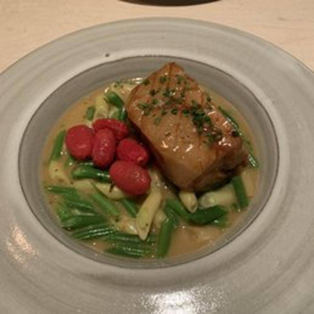 Indulge in a meticulously prepared pork belly, slow-cooked to an exquisite tenderness, then expertly seared to unveil a captivatingly crisp exterior. This rich and savory offering is designed to melt in your mouth, complemented by artful accompaniments.