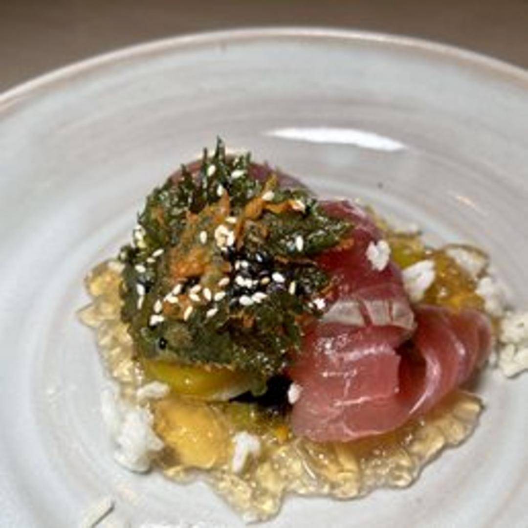 A refined Japanese-inspired dish featuring fresh tuna quickly seared on the exterior, leaving the interior beautifully rare and cool. The brief searing creates a delicate char, while the vibrant, tender flesh remains uncooked, often sliced thin and served with a bright, citrusy ponzu sauce and aromatic garnishes.
