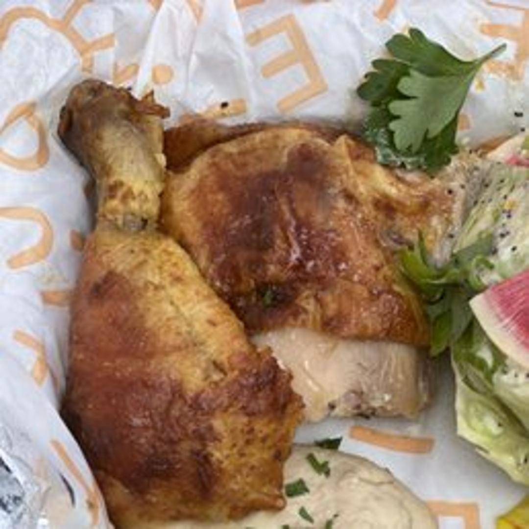 Whole chicken, slow-cooked on a rotisserie for crispy skin and juicy meat. Seasoned with a blend of herbs and spices. Perfect for sharing or enjoying throughout the week.