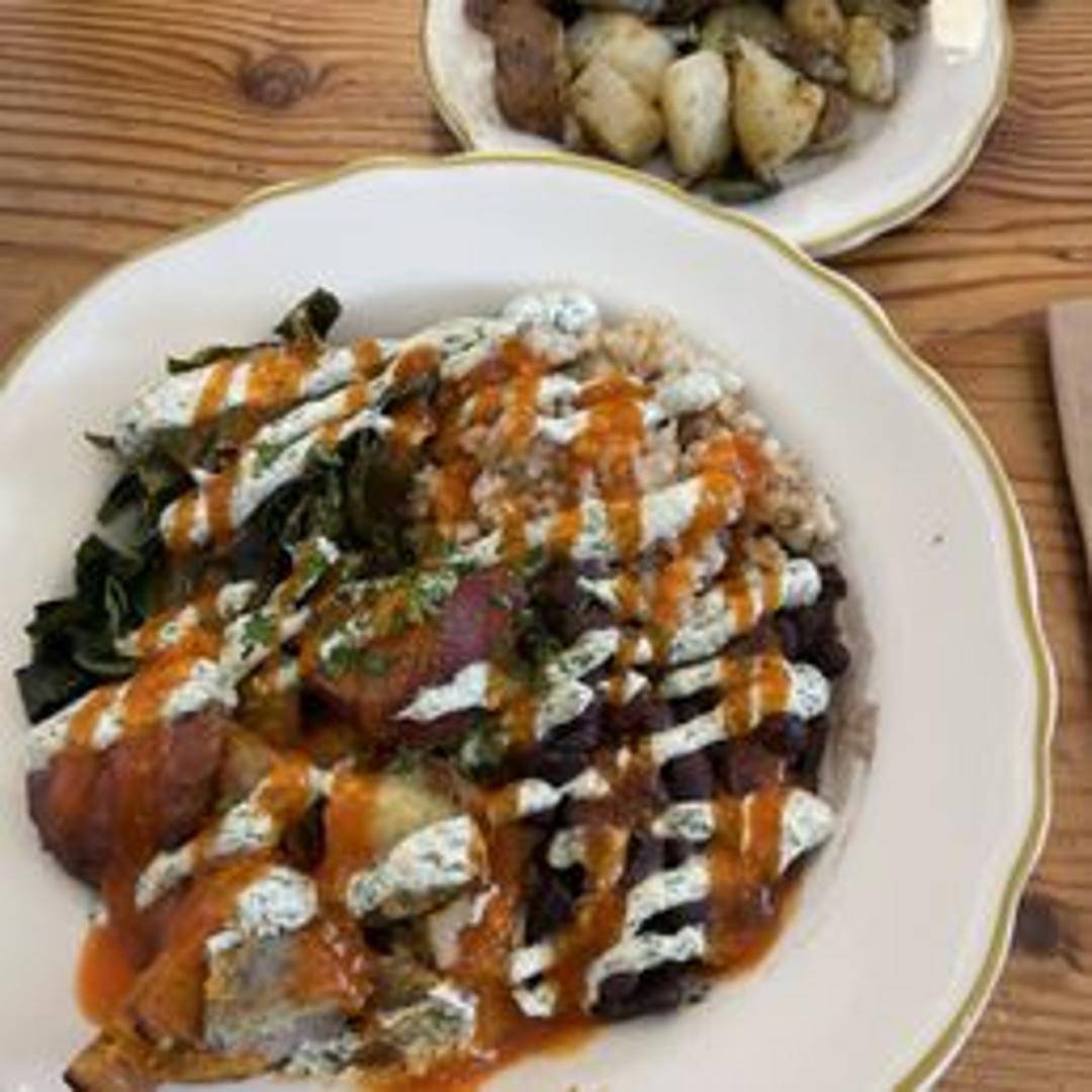 A flavorful bowl featuring crispy buffalo tofu or tempeh (specify option), quinoa, black beans, pickled onions, creamy vegan ranch dressing, and shredded carrots. A spicy and satisfying plant-based meal.