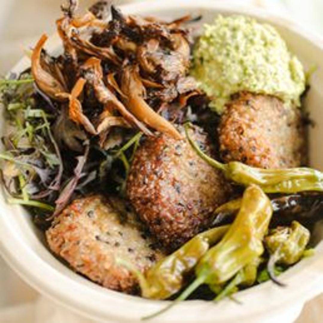Savory rice cake topped with sauteed mushrooms, garlic, and herbs. Drizzled with a balsamic glaze and garnished with fresh parsley.