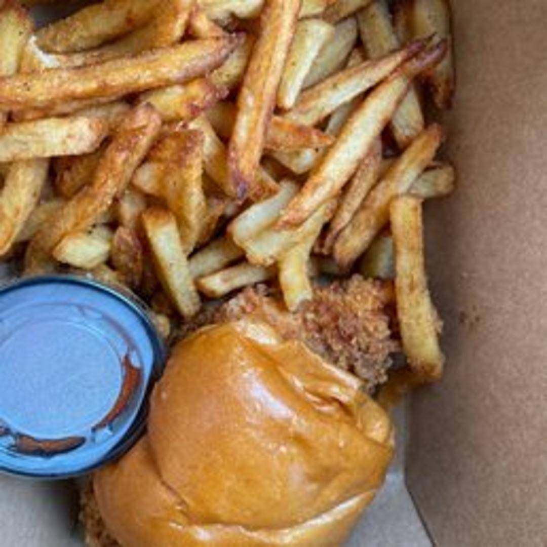 Our Crispy Chicken Sandwich features a perfectly fried, golden-brown chicken breast, incredibly juicy on the inside and satisfyingly crunchy on the outside. Served on a toasted brioche bun with fresh lettuce, ripe tomato, pickles, and a zesty house-made aioli for a classic, elevated taste.