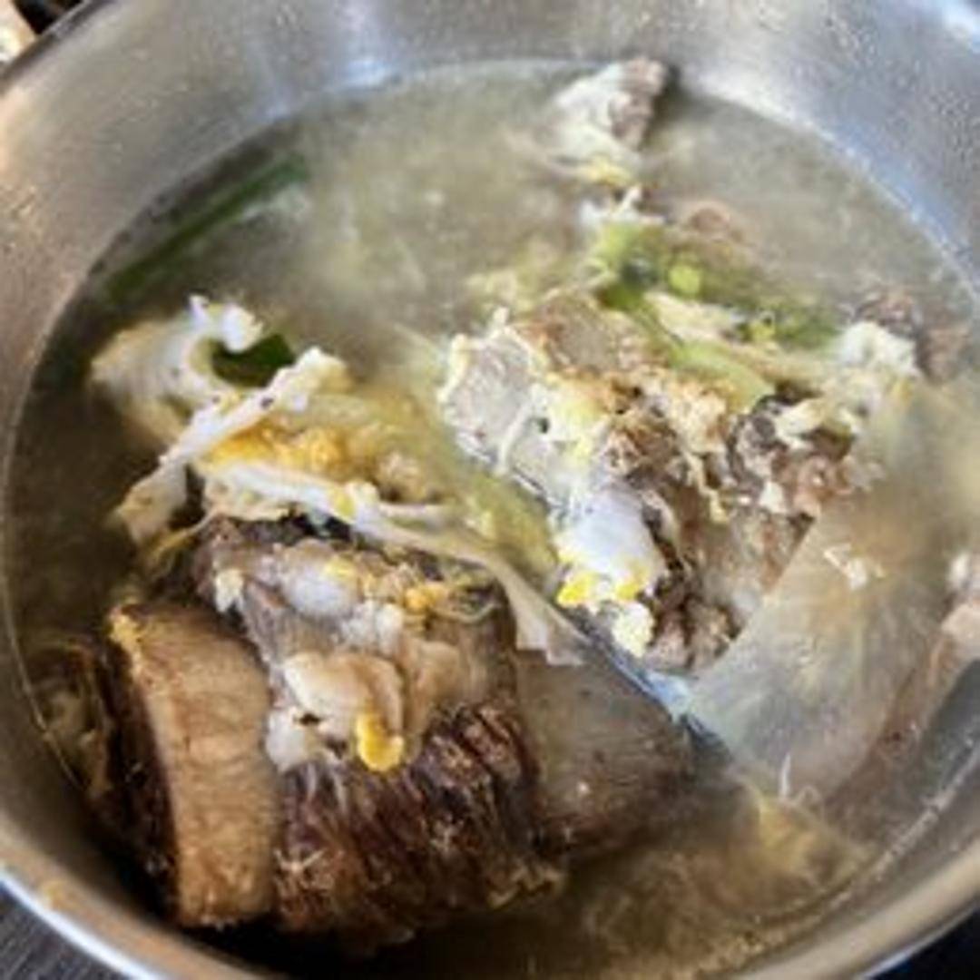 A hearty and nourishing soup made with tender short ribs in a clear broth. Contains glass noodles, vegetables, and a subtle savory flavor.