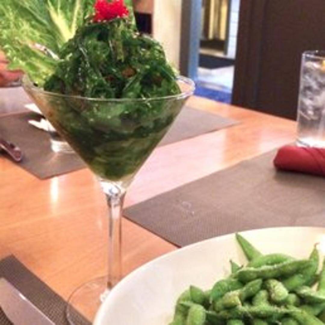 A refreshing salad made with marinated seaweed, often with sesame seeds and a light dressing.