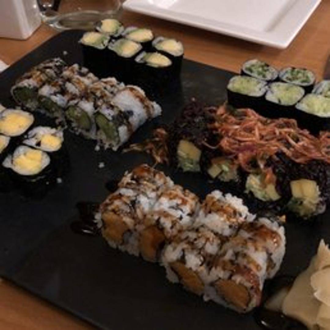 Avocado, cucumber, asparagus, and seaweed salad roll.