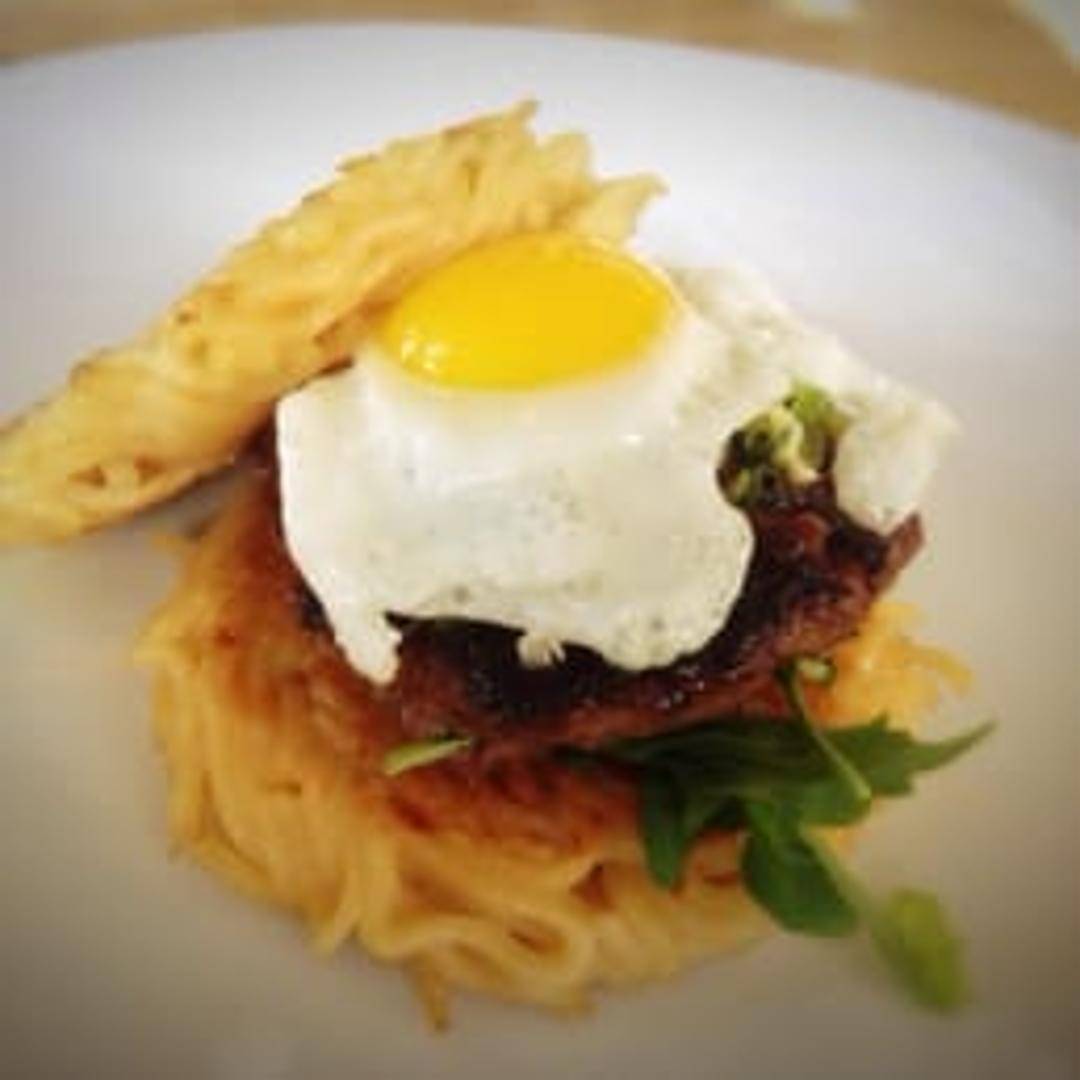 A unique culinary creation featuring a juicy burger patty nestled between two grilled ramen noodle 'buns.' The savory noodles provide a delightful textural contrast to the flavorful patty, typically topped with Asian-inspired sauces and toppings like seaweed salad and pickled ginger.