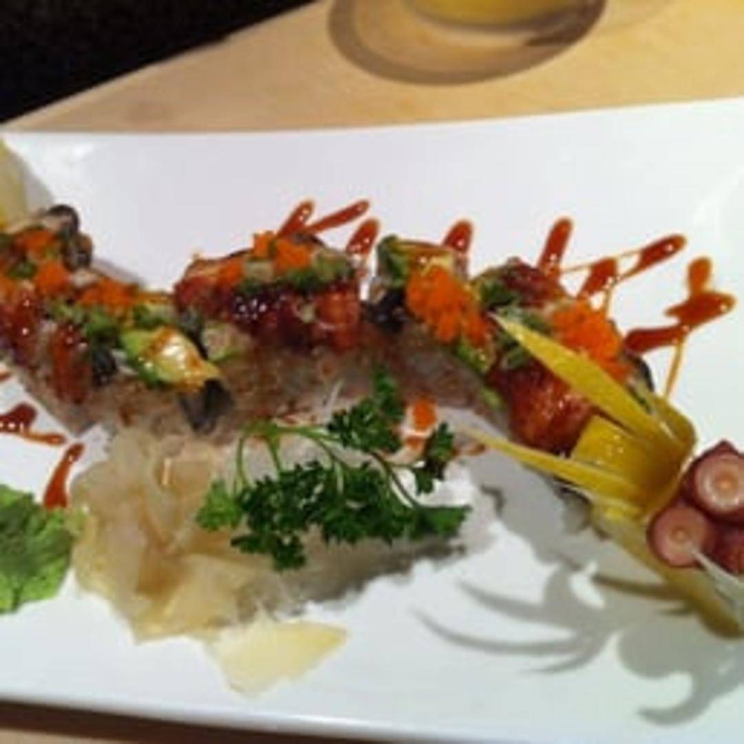 A visually striking roll typically made with crab, cucumber, and avocado, topped with slices of avocado that resemble dragon scales and often drizzled with eel sauce.