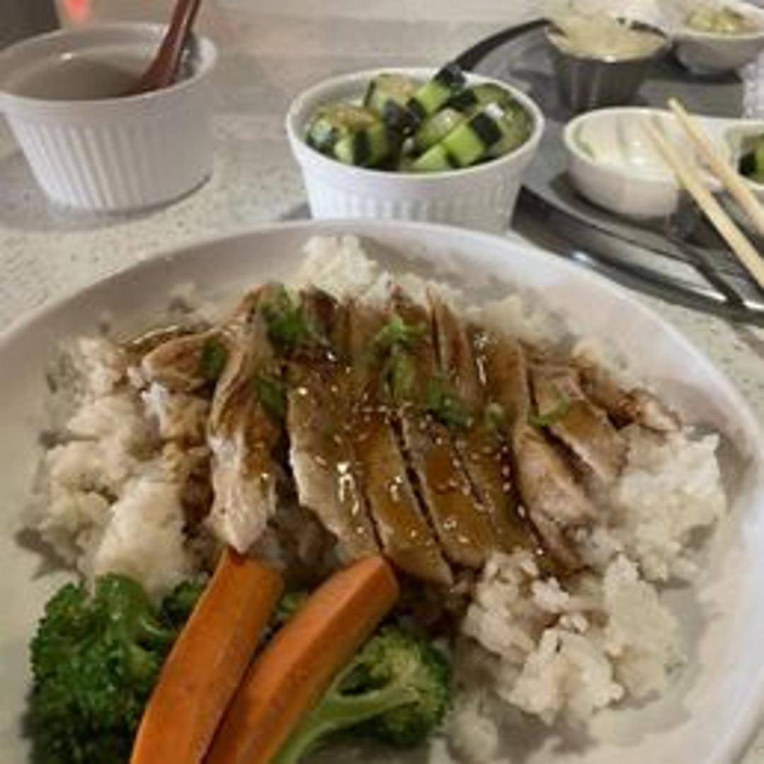 A savory bowl featuring grilled chicken glazed with teriyaki sauce, served over a bed of steamed rice. Often includes steamed or stir-fried vegetables.